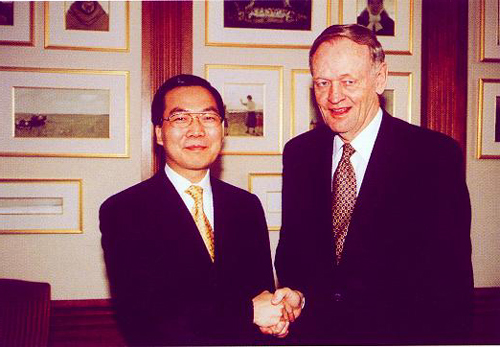 | 二零零二年五月下旬,由香港國際投資總商會會長許智明博士率領的代表團應邀到訪加拿大,進行經貿合作洽商和投資環境考察,受到加拿大政府部門和國會議員、政府官員、商界及社團領袖的友好接待。加國政府高度重視香港國際投資總商會代表團的訪問,特別在國會議事大廳召開的國會議員大會上,隆重介紹和熱烈歡迎許智明博士一行的來訪。加拿大政府部門負責人還在國會山庄、國會議員俱樂部宴請了許智明博士率領的代表團。六月四日,加拿大總理克里蒂安親切接見了香港國際投資總商會會長許智明博士,在渥太華克里蒂安總理辦公室進行了話題廣泛的愉快交談。 在渥太華、溫哥華和卑斯省等城巿和地區訪問期間,受到了加拿大移民部長丹尼斯•科登勒、西方多樣化經濟部長斯蒂芬•歐文、亞太事務部部長戴維•克爾高、移民委員會主席喬•芬塔納、外交及國際貿易部負責人斯安儒、木材工業部主任助理勞拉•奧爾森、卑斯省省長金寶俞等加國政府部門官員分別接見了由該會會長許智明博士率領的香港國際投資總商會代表團,進行了廣泛的合作交流,增進了代表團對加拿大豐富的自然資源、廣泛的經貿合作領域以及投資政策的認識,並對加拿大文化多元化的優越性、優良的投資環境增加了了解,為加強香港和中國內地商界與加拿大貿易和投資合作創造了條件。 |