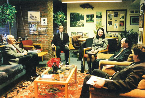 | 二零零二年二月和十二月,香港國際投資總商會會長許智明博士一行應邀兩次到訪了美國哈佛大學,與該校肯尼迪政府學院約瑟夫•奈院長進行會談。去年初的訪問中,許智明博士向美國朋友介紹了二十多年民營經濟的發展和適應國際競爭和發展需求;為中國民營企業家文化和學術素質提高創造條件,哈佛大學肯尼迪政府學院承諾為中國民營企業家開設培訓課程和合作進行有關民營企業發展的學術研究。期後,雙方合作的「中國民營企業的現狀和未來」課題研究得以實施,並取得進展,預計今年將有該項目的研究成果出版。