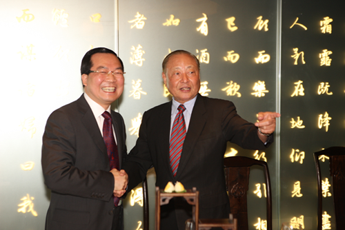 | 香港國際投資總商會會長許智銘博士與崔世安博士親切握手,祝賀崔世安博士高票當選澳門第三任行政長官。 |