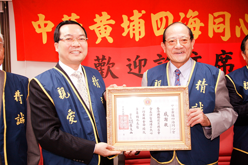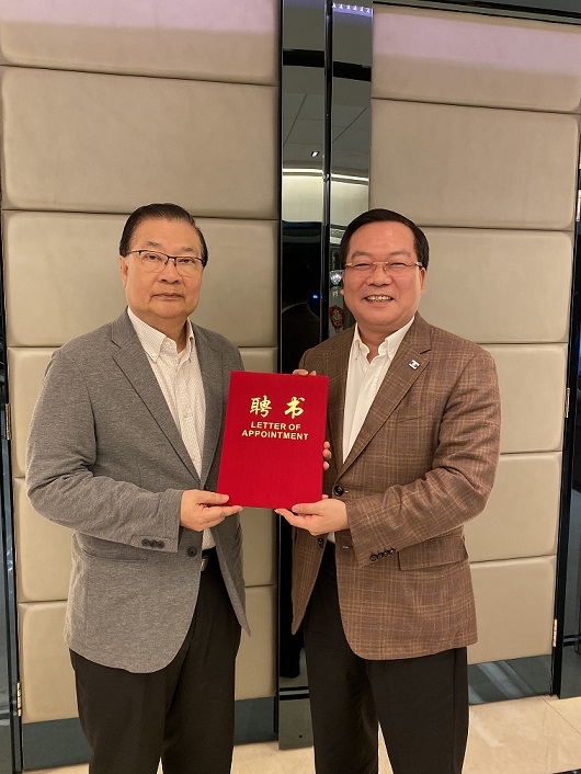 香港國際投資總商會會長許智銘博士太平紳士向譚耀宗大紫荊勳賢頒發了聘任證書。 |