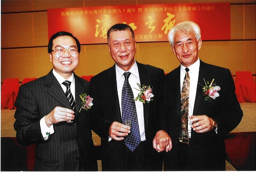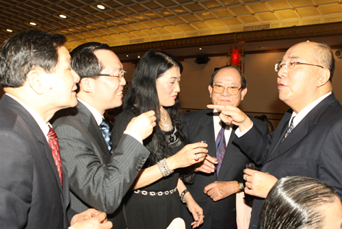 | 香港國際投資總商會會長 許智銘博士(右一),副會長梁仲景(左三)和名譽會長黃錦波(左一)向曹伯純書記(右二)敬酒 。 |