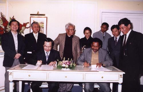 | 許智銘博士和努爾‧阿曼將軍分別代表香港國際投資總商會和印尼民族振興基金會在合作發展印尼木薯種植項目的協議書上簽字並交換協議書文本