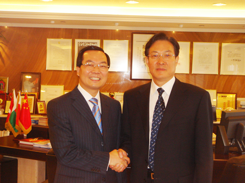 | 香港國際投資總商會會長 許智銘博士(左)與貴港巿湯賴德榮巿長(右)親切握手。 |
