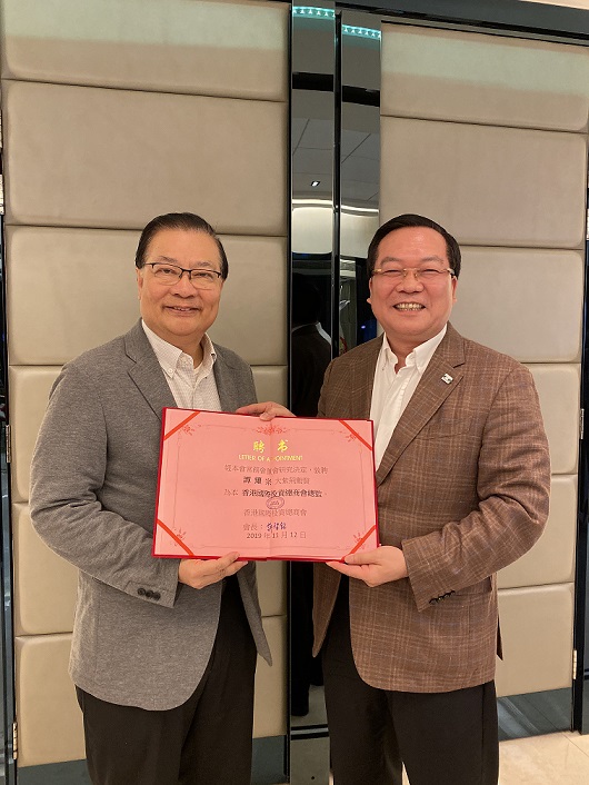2019年11月12日香港國際投資總商會會長許智銘博士太平紳士代表香港國際投資總商會常務會董會向譚耀宗大紫荊勳賢頒發了聘任證書,譚耀宗大紫荊勳賢正式出任香港國際投資總商會總監。 |